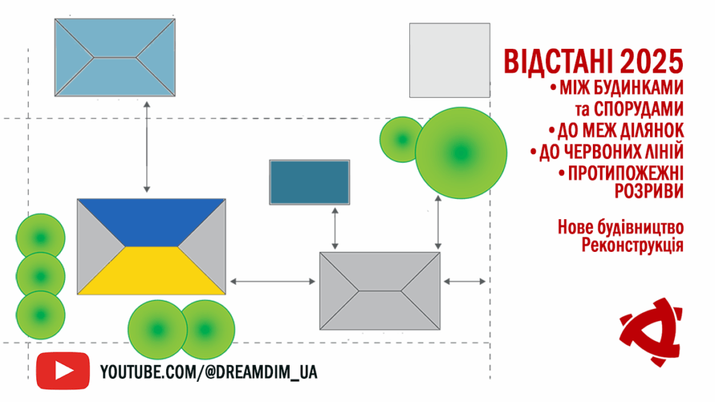 01 жовтня 2019 року набрали чинності ДБН Б.2.2-12:2019 Планування та забудова територій, якими, зокрема, регулюють питання забудови, в т.ч. і питання відстаней між будинками, будівлями та спорудами як на власній, так і на сусідніх ділянках, відстаней до меж земельних ділянок, протипожежних розривів, відстаней до дерев, кущів, відстаней до інженерних мереж тощо.
